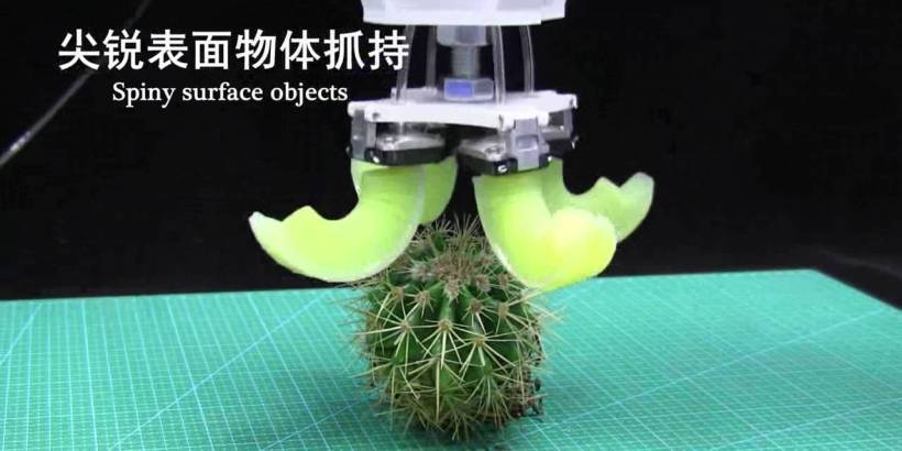 上圖中抓取仙人球的機(jī)器人(氣動(dòng)軟體抓持器)由北京航空航天大學(xué)設(shè)計(jì),可正反彎曲,能夠輕松抓取各種類型的物體。在不久前的漢諾威工業(yè)博覽會(huì)上,德國(guó)自動(dòng)化公司Festo與北航合作發(fā)明的機(jī)器人手Octopus Gripper受到了默大媽的青睞,該機(jī)器人仿照章魚(yú)觸手的吸盤(pán),通過(guò)抽出空氣夾緊物品。