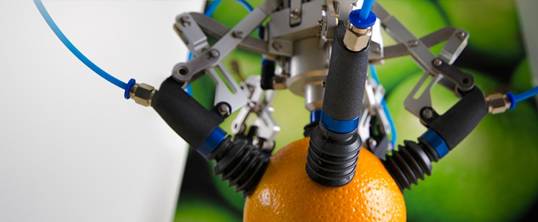 上圖為Cambridge Consultants發(fā)明的水果采摘機(jī)器人,不同于一般夾具,這個(gè)機(jī)器手裝備有機(jī)器視覺(jué)和機(jī)器學(xué)習(xí)系統(tǒng),能智能識(shí)別抓取對(duì)象,計(jì)算抓取順序,并舉起、放下物品。研究人員Wrench表示,他希望能看到有朝一日機(jī)器人能和人一起工作,比如收獲像梨、蘋(píng)果這樣已“受傷”的果實(shí)。