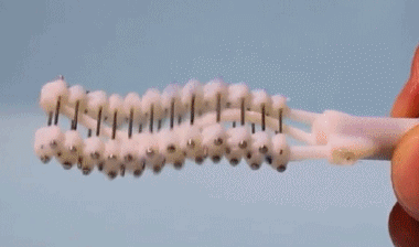 這小家伙是怎么扭起來的?其實在它波浪形的結(jié)構(gòu)里面,藏著一個螺旋形的骨架。這個骨架在電機的帶動下旋轉(zhuǎn),這個旋轉(zhuǎn)最終在垂直方向上的效果就是形成了一個連續(xù)運動的波浪。