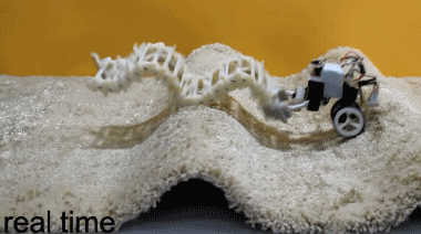 這個波浪小機器適應(yīng)不同環(huán)境的能力還相當(dāng)不錯,它可以爬過不平的地面: