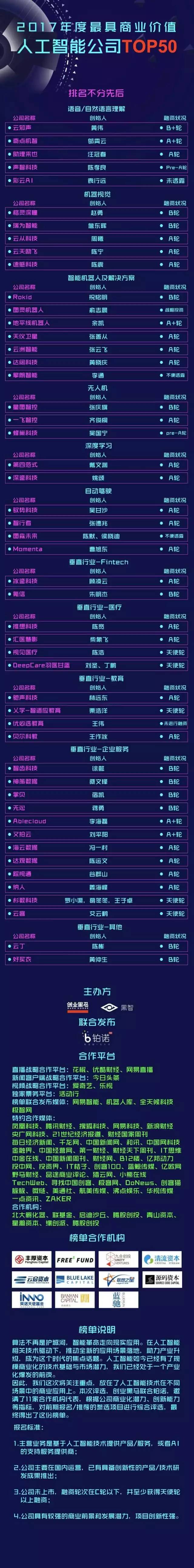 因此,創(chuàng)業(yè)黑馬、黑智,與鉑諾聯(lián)合發(fā)布了這份《2017年度最具商業(yè)價值人工智能創(chuàng)新公司TOP50》榜單。