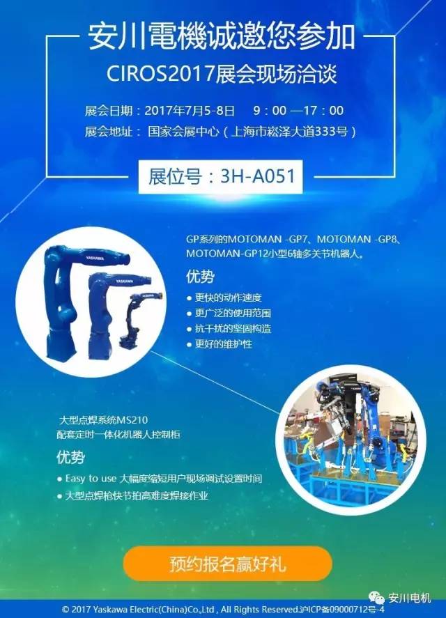 本次展會,您提前預(yù)約安川展會現(xiàn)場洽談,憑預(yù)約確認(rèn)短信和安川銷售洽談后可在安川展臺領(lǐng)取小禮品一份。禮品數(shù)量有限,送完為止。請您至少提前一天預(yù)約現(xiàn)場洽談哦。