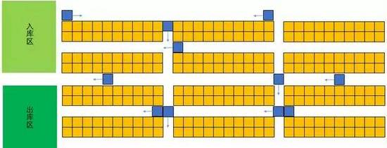 不同的貨架擺放方式也會(huì)直接影響到揀選機(jī)器人的效率,本文使用下圖所示的擺放方式進(jìn)行設(shè)計(jì)。該方法對(duì)于其他路網(wǎng)模型的兼容性較高,研究成果擴(kuò)展性較強(qiáng),同時(shí)該模型可以最大化倉(cāng)儲(chǔ)空間,也是物流車輛和倉(cāng)儲(chǔ)快速對(duì)接的一種最大化空間利用模型。
