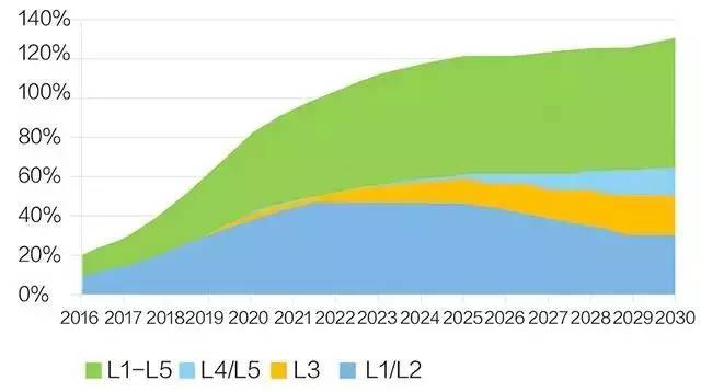全球 L1-L5 智能駕駛市場的滲透率會在接下來 5 年內(nèi)依靠 ADAS 市場的高速發(fā)展而處于高速滲透期,然后伴隨半無人駕駛的普及進(jìn)入穩(wěn)速增長期,在來到 2025 年無人駕駛放量階段后,依賴全產(chǎn)業(yè)鏈的配合而進(jìn)入市場成熟期。
