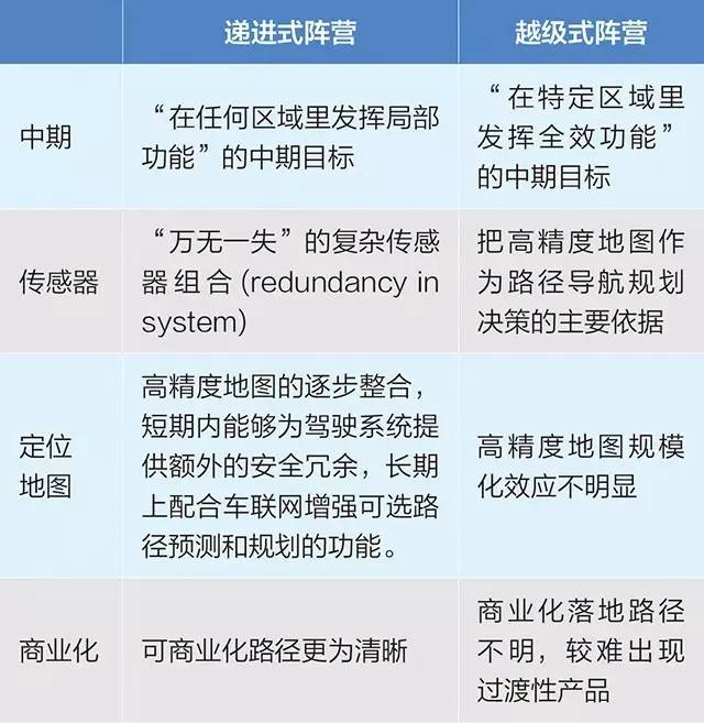 自動駕駛領(lǐng)域目前基本分為兩大陣營: 以傳統(tǒng)汽車廠商和 Mobileye 合作的“遞進(jìn)式”應(yīng)用型陣營,以谷歌、百度以及初創(chuàng)科技公司為主的“越級式” 研究型陣營。