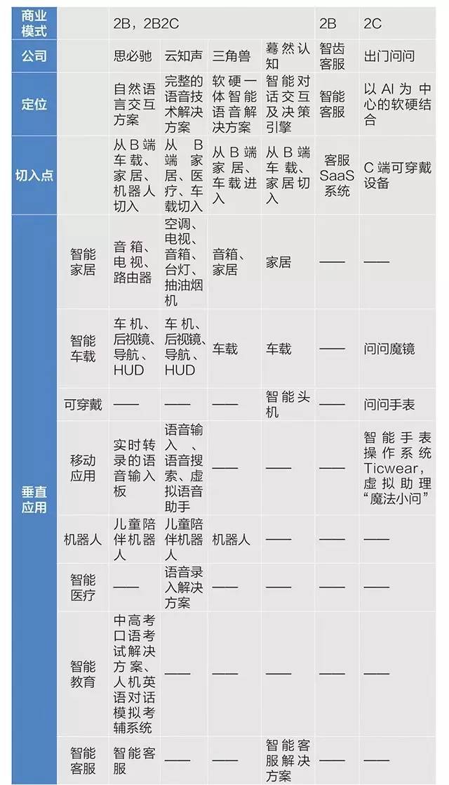 創(chuàng)業(yè)公司則以垂直領(lǐng)域和細(xì)分場景為突破口,重點(diǎn)布局家居,車載和可穿戴設(shè)備,以及客服、金融、醫(yī)療等垂直領(lǐng)域。