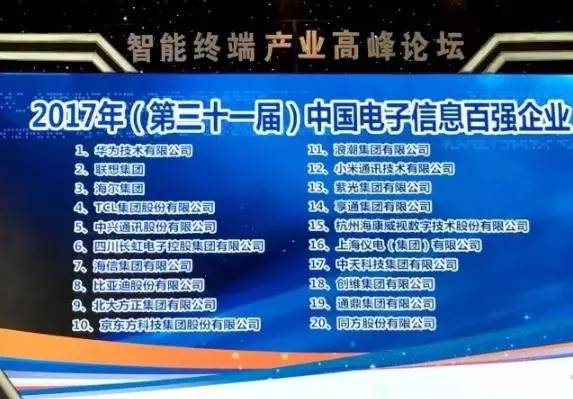 7月21日,在工業(yè)和信息化部的指導下,2017年中國電子信息百強企業(yè)發(fā)布暨智能終端產(chǎn)業(yè)高峰論壇在貴州遵義召開,會上發(fā)布了“2017年(第三十一屆)中國電子信息百強企業(yè)”。???/a>威視位列15,較2016年上升4位,這是公司繼2008 年首次參評以來,連續(xù)十年入選中國電子信息百強榜單。