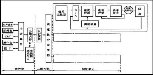 兩級(jí)分布式控制系統(tǒng),通常由上位機(jī)、下為機(jī)和網(wǎng)絡(luò)組成。上位機(jī)可以進(jìn)行不同的軌跡規(guī)劃和控制算法,下位機(jī)進(jìn)行插補(bǔ)細(xì)分、控制優(yōu)化等的研究和實(shí)現(xiàn)。上位機(jī)和下位機(jī)通過(guò)通訊總線相互協(xié)調(diào)工作,這里的通訊總線可以是RS-232、RS-485、EEE-488 以及USB 總線等形式。