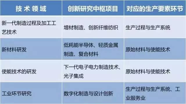 在第四次工業(yè)革命的戰(zhàn)略布局方面,美國(guó)白宮在2012年3月提出了“國(guó)家制造創(chuàng)新網(wǎng)絡(luò)計(jì)劃”,在制造業(yè)的4大領(lǐng)域建立9個(gè)研究創(chuàng)新中樞(如下圖)。