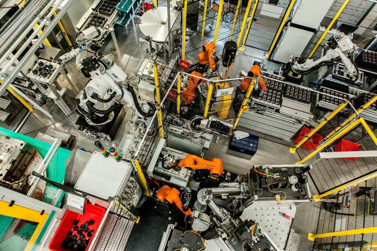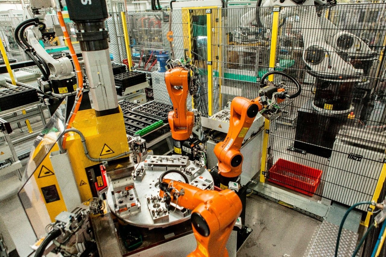 一臺(tái)KUKAKR5 型電弧焊機(jī)器人將最頂端的托盤拿掉并將其放入特制的框架中。該機(jī)器人會(huì)將空托盤收起并放置在向外傳送的傳送帶上。之后,一臺(tái)KUKA KR 6 R900型機(jī)器人會(huì)將導(dǎo)線架放置到旋轉(zhuǎn)工作臺(tái)上的沖壓模具中,該工作臺(tái)有四個(gè)沖壓工具,用該工具將導(dǎo)線架上的小車連接銷解開。四臺(tái)屬于KR AGILUS系列的KUKA KR 6 R900型機(jī)器人開始工作,每一臺(tái)移除五個(gè)小車連接器,三個(gè)傳感器銷,并從沖壓工具上移除 2 個(gè)電池連接銷并將它們放在兩個(gè)移動(dòng)滑塊上,這就是準(zhǔn)備過程與注塑成型過程的分界點(diǎn)。一臺(tái)屬于KUKA中等負(fù)載型號(hào)的機(jī)器人承擔(dān)裝載注塑成型機(jī)的任務(wù)。“這臺(tái)機(jī)器人和 KR6 R900型的機(jī)器人是這套系統(tǒng)的核心。”Tesch解釋說(shuō)。