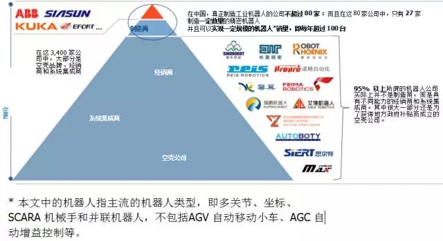 經(jīng)過仔細的研究,我們發(fā)現(xiàn)除了排名前14家的機器人制造商之外,只有13家公司具備一定的生產(chǎn)和銷售能力。而另外95% 以上所謂的機器人公司實際上并不是制造商,而是具有不同能力的經(jīng)銷商和系統(tǒng)集成商,其中很大一部分還是為了獲得地方政府補貼而成立的空殼公司。