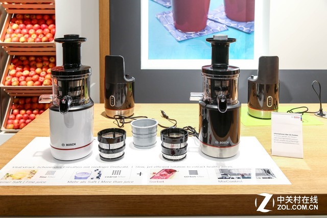 逛展逛累了,在這個(gè)時(shí)候,喝一杯鮮榨的果汁別提有多美了!博世就展出了不同型號的榨汁機(jī),針對不同果蔬類型,都有不同機(jī)型來搭配使用,而且看上去比國產(chǎn)榨汁機(jī)在“個(gè)頭”上大了許多。