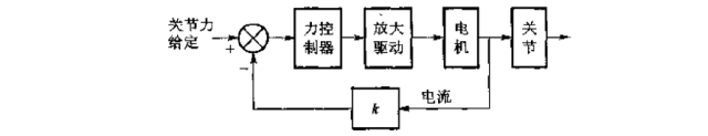 圖1-3為關節(jié)的力/力矩控制框圖。由于關節(jié)力/力矩不易直接測量,而關節(jié)電機的電流又能夠較好的反映關節(jié)電機的力矩,所以常采用關節(jié)電機的電流表示當前關節(jié)力/力矩的測量值。力控制器根據(jù)力/力矩的期望值與測量值之間的偏差,控制關節(jié)電機,使之表現(xiàn)出期望的力/力矩特性。