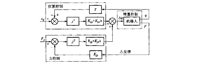 圖1-4所示為一種力位混合控制的框圖,它由位置控制和力控制兩部分組成。位置控制為PI控制,給定為機器人末端的笛卡爾空間位置,末端的笛卡爾空間位置反饋由關節(jié)空間的位置經過運動學計算得到。圖中,T為機器人的運動學模型,J為機器人的雅克比矩陣。末端位置的給定值與當前值之差,利用雅克比矩陣的逆矩陣轉換為關節(jié)空間的位置增量,再經過PI運算后,作為關節(jié)位置增量的一部分。
