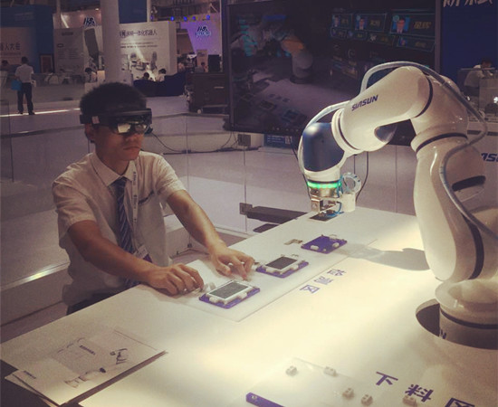 與其它前沿技術(shù)融合。比如與AR技術(shù)整合提高作業(yè)效率,就非常有代表性。正如同樣具有工業(yè)協(xié)作價(jià)值的還有可穿戴設(shè)備AR眼鏡,在2017世界機(jī)器人大會(huì)上,新松機(jī)器人率先拿出了他們的“協(xié)作機(jī)器人+AR眼鏡”的解決方案,用于產(chǎn)品生產(chǎn)環(huán)節(jié)的原材料加工監(jiān)測(cè)。
