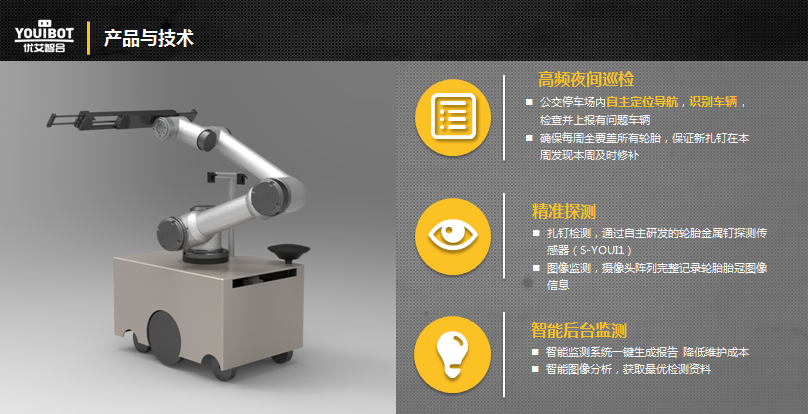 對此,“優(yōu)艾智合”機(jī)器人主要有三大特點(diǎn):主動輪懸掛差速移動系統(tǒng),可完全適應(yīng)停車場路況和公交??凯h(huán)境,自主定位,精確到亞米級,識別車輛檢查后并上報有問題車輛;其自主研發(fā)的倫倫金屬釘探測傳感器可百分百精確檢測到金屬異物,且圖像監(jiān)測,攝像頭陣列可完整記錄輪胎冠像信息;之后,其智能后臺監(jiān)測系統(tǒng)一鍵生成報告,獲取最優(yōu)檢測資料。