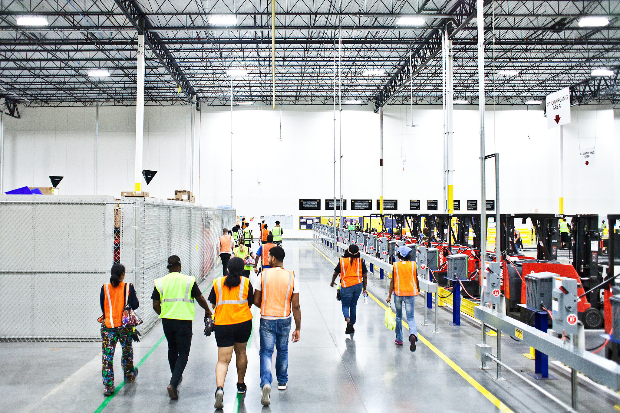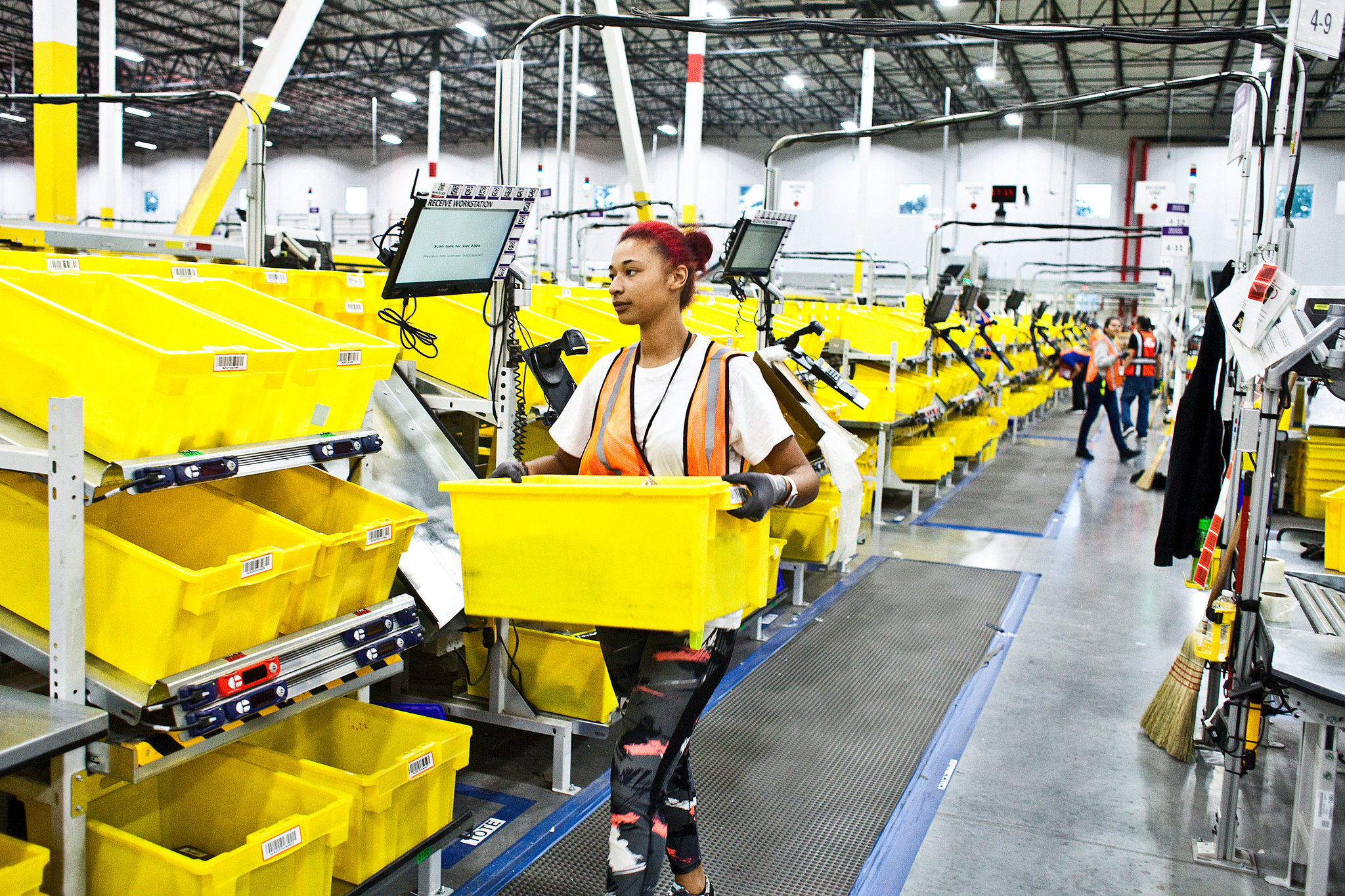 在亞馬遜位于新澤西佛羅倫薩的倉庫,21歲的妮薩·斯科特在看守用于堆疊裝滿商品的箱子的機械臂