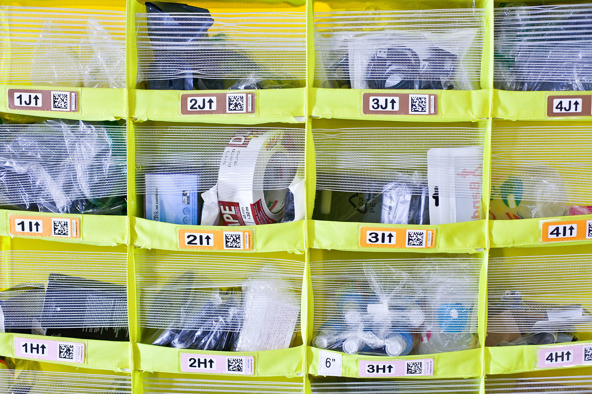 在封閉區(qū)域的一個邊緣上,一群人類工人——“充填工”——往貨架填充產(chǎn)品,補充存貨。機器人會帶走那些貨架,而當顧客訂單到達,需要它們托著的產(chǎn)品的時候,它們就會在封閉區(qū)域另一個邊緣上的站點排隊等候,就像汽車在收費站等候繳費那樣。
