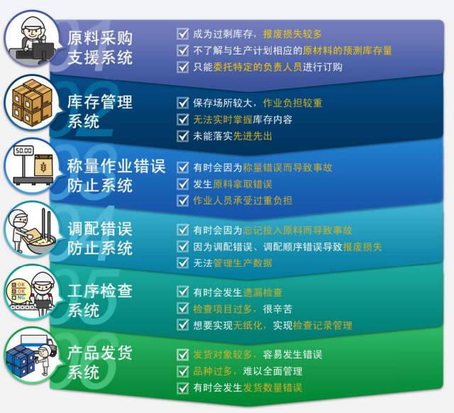 品質(zhì)管理追溯系統(tǒng)QITEC,適用于有人工計(jì)量配料的各種行業(yè)。(食品,飲料,日用品,化妝品,藥品,化工等),通過(guò)6大封裝,解決工廠生產(chǎn)現(xiàn)存課題,從不流出次品的工廠,到不生產(chǎn)次品的工廠。