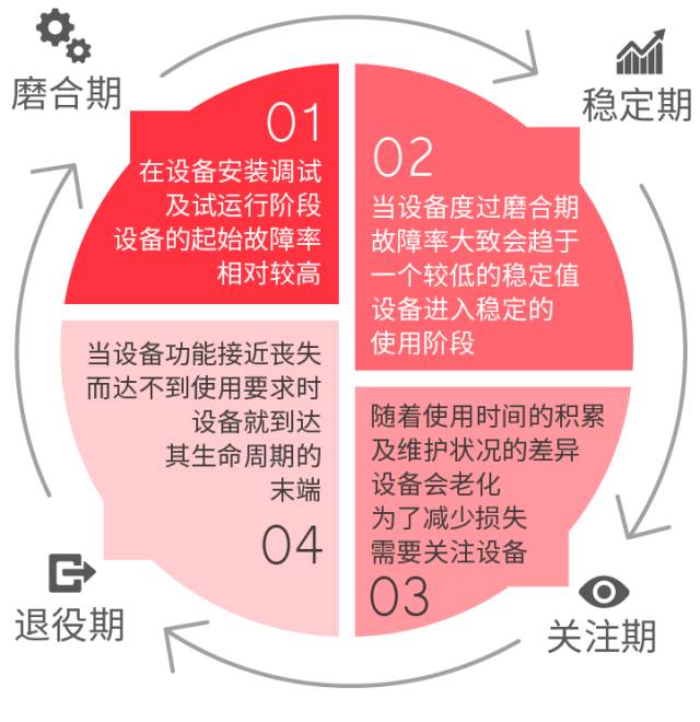 傳統(tǒng)的設(shè)備生命周期分為早期故障期,偶然故障期,嚴(yán)重故障期。ABB從更加貼近客戶(hù)設(shè)備管理需求的視角,對(duì)設(shè)備生命周期進(jìn)行了新的劃分:磨合期、穩(wěn)定期、關(guān)注期和退役期。
