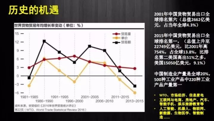 下面是反映世界貿(mào)易的圖片,其中有貿(mào)易額包括單價(jià)和整個(gè)相應(yīng)的量,2002年中國(guó)的貿(mào)易額排在全球第六,15年之后中國(guó)居于首位,而且超出美國(guó)51%左右。這個(gè)浪潮在中國(guó)的八十年代,WTO市場(chǎng)經(jīng)濟(jì)開始做買賣了,信息家電出現(xiàn)第一次市場(chǎng)化。第二次浪潮是在二十年代初,電商開始涌現(xiàn),房地產(chǎn)、汽車以及智能手機(jī)推動(dòng)了這十年的發(fā)展。而新的一輪浪潮,我們期待人工智能、機(jī)器人、生物和相應(yīng)的智能制造等方面,所以我認(rèn)為這個(gè)浪潮在全世界范圍內(nèi)回溯。