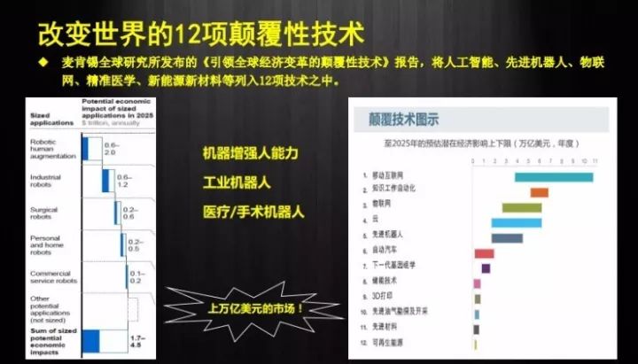 從狹義上理解,機(jī)器人就是自動(dòng)化的智能機(jī)器,人工智能其實(shí)就是通過(guò)大數(shù)據(jù)決策的一種智能學(xué)習(xí)與決策軟件,并且以人工智能與機(jī)器人為先導(dǎo),帶動(dòng)了其他技術(shù)變革速度,加速了各個(gè)行業(yè)與社會(huì)生活的應(yīng)用推廣。在這個(gè)方面,麥肯錫發(fā)布了《引領(lǐng)全球經(jīng)濟(jì)變革的顛覆性技術(shù)》,一共有12項(xiàng),如下圖所示。