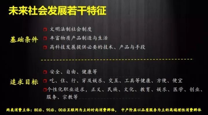 科技浪潮推動(dòng)的本質(zhì)上是由社會(huì)形態(tài)決定痛點(diǎn)需求,由痛點(diǎn)需求決定產(chǎn)品,產(chǎn)品與服務(wù)決定了企業(yè)形態(tài),科技技術(shù)決定了企業(yè)的競(jìng)爭(zhēng)力。比如:社會(huì)形態(tài)造成了個(gè)體工作緊張、繁忙與獨(dú)處,也決定了你希望了解變化的世界并同時(shí)保持自己的寧?kù)o,人內(nèi)心也開始需要一種網(wǎng)絡(luò)化的溝通方式,從而也就出現(xiàn)了我們所用的微信社交軟件,人的交互發(fā)生了變化。未來(lái)社會(huì)的基礎(chǔ)條件,法制文明物質(zhì)豐富高水平的牽引,物質(zhì)生活比較豐富的國(guó)家都在追求這三個(gè)事情,文明民主與安全,其次是吃住行娛樂(lè)健康方便變成人一種內(nèi)心和舒適的分享,隨后就是個(gè)性化職業(yè)的追求,包括創(chuàng)業(yè)、藝術(shù)、科學(xué)、宗教、服務(wù)等。