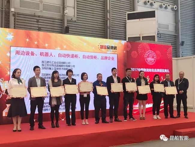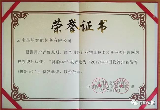 11月2日,2017中國物流知名品牌頒獎典禮在上海Cemat Asia2017展會期間隆重舉行。頒獎典禮上,昆船AGV獲得了“2017中國物流知名品牌(機器人)”證書。