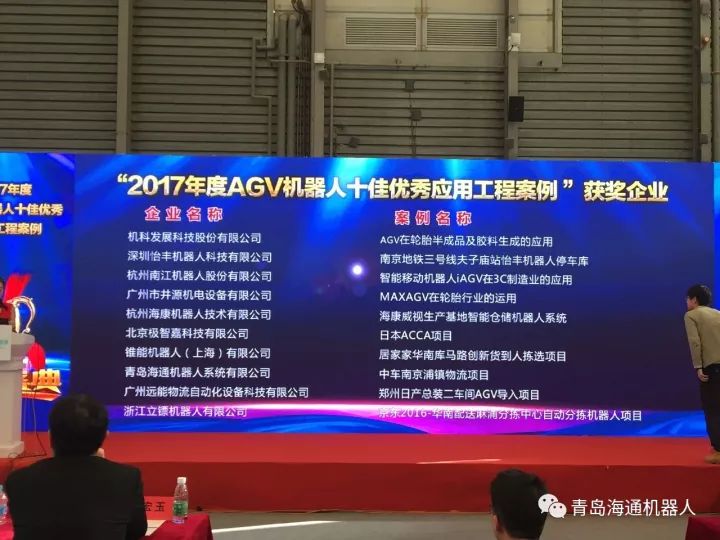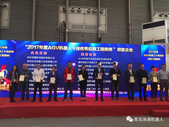 同時(shí),“2017年度AGV機(jī)器人十佳優(yōu)秀應(yīng)用工程案例”頒獎(jiǎng)盛典在展會(huì)期間進(jìn)行,青島海通機(jī)器人獲此殊榮。