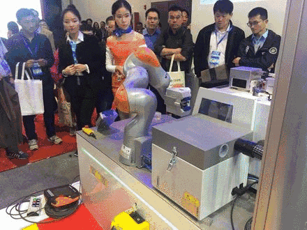 現(xiàn)場(chǎng)工作人員向來(lái)賓展示與解說(shuō)KUKA機(jī)器人的功能與使用。