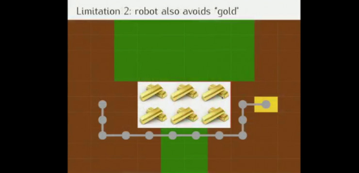 策略2:而如果設(shè)定反向激勵(lì),機(jī)器人會(huì)對(duì)訓(xùn)練時(shí)未出現(xiàn)的元素敬而遠(yuǎn)之,機(jī)器人不知道巖漿是好雞還是懷,也可能如上圖所示錯(cuò)過“金礦”。