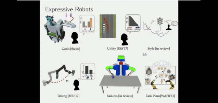 上述討論的很多都是機(jī)器人如何估計(jì)人類隱藏參數(shù)的研究,另一種方式則是人如何思考與機(jī)器人互動(dòng)中的參數(shù)的推斷,這方面的研究一直在進(jìn)行,而且需要機(jī)器人有更多的表現(xiàn)力。對(duì)于不同人,機(jī)器人同樣的動(dòng)作也會(huì)產(chǎn)生不同的后果,即便人類無法正確推斷機(jī)器人行為的時(shí)候,至少要讓他們知道發(fā)生了什么事,你想做的是什么,為什么交互沒有取得更好的結(jié)果等等。機(jī)器人需要注意這個(gè)更微妙的影響,因?yàn)樗鼪Q定了人們是否了解機(jī)器人正在做什么,是否有信心在執(zhí)行任務(wù)等。