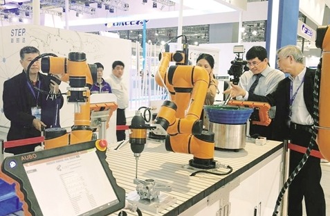 在第十九屆工博會(huì)上,中國工程院院士倪光南(右一)在遨博智能科技有限公司展臺(tái)觀看其展出的具有自主知識(shí)產(chǎn)權(quán)的最新工業(yè)協(xié)作機(jī)器人。經(jīng)濟(jì)日?qǐng)?bào)記者 許紅洲攝