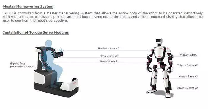 下面讓我們一起來(lái)看下這個(gè)高約 1.5 m,重達(dá) 75kg 的 T-HR3 究竟神奇在哪里。首先亮點(diǎn)在一個(gè)主操控系統(tǒng)(Master Maneuvering System),用戶(hù)可通過(guò)一套可穿戴式控制裝置對(duì)機(jī)器人進(jìn)行操控,系統(tǒng)可將人體的動(dòng)作精準(zhǔn)地映射到機(jī)器人上,從而實(shí)現(xiàn)機(jī)器人與用戶(hù)的動(dòng)作同步。此外,用戶(hù)還能借助機(jī)器人的眼睛和雙手,來(lái)感知周?chē)h(huán)境。