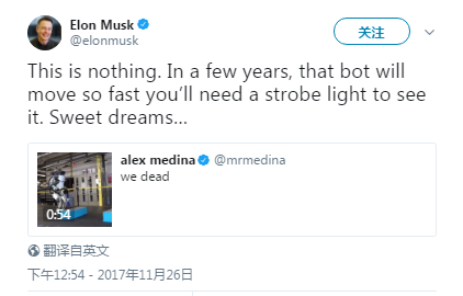 馬斯克表示:“這沒(méi)什么,幾年后,這個(gè)機(jī)器人會(huì)移動(dòng)得太快,你需要一盞頻閃燈才能看到它。。。”