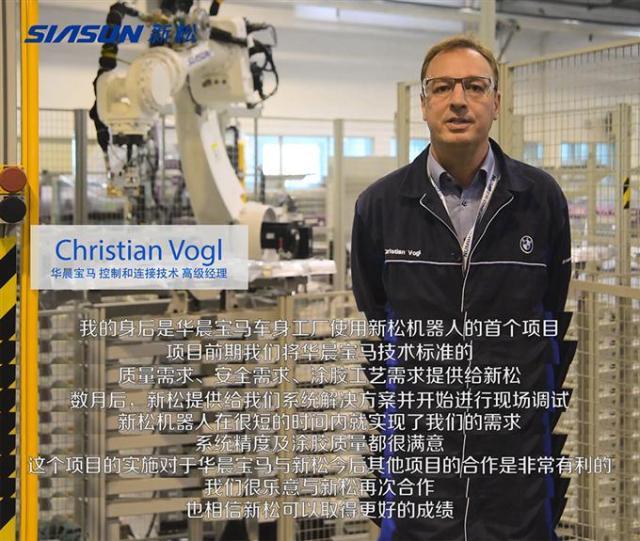 “我的身后是華晨寶馬車身工廠使用新松機器人的首個項目,新松在很短的時間內(nèi)就實現(xiàn)了我們的需求,系統(tǒng)精度及涂膠質量都令人滿意?!痹谝欢斡嘘P該項目的視頻中,華晨寶馬控制和連接技術高級經(jīng)理Christian Vogl微笑著說,“這個項目的實施對于華晨寶馬與新松今后其他項目的合作是非常有利的,我們很樂意與新松再次合作,也相信新松可以取得更好的成績?!?