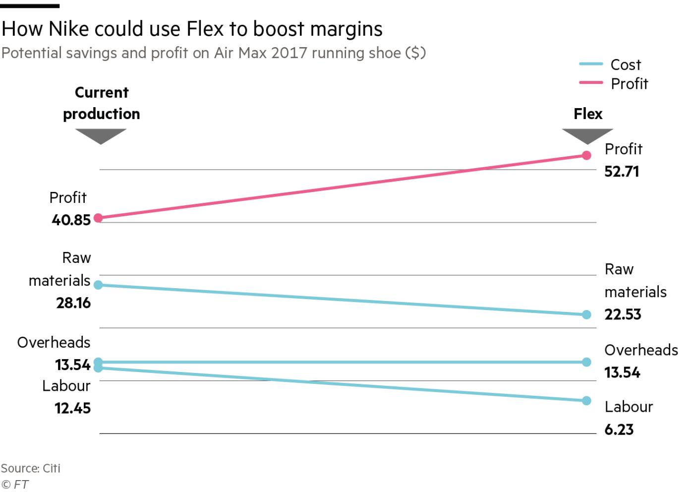圖自《金融時(shí)報(bào)》 據(jù)花旗銀行分析師估計(jì),用 Flex 生產(chǎn)工序來制造 2017 Air Max,勞動(dòng)和材料成本將分別減少 50% 和 20%。
