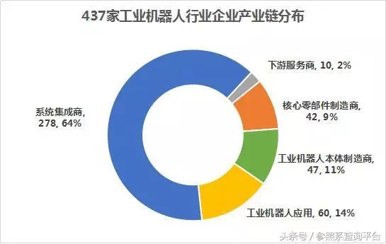 截至2017年11月初,參照系優(yōu)質企業(yè)數(shù)據(jù)庫共收錄437家工業(yè)機器人行業(yè)關聯(lián)企業(yè)。從產(chǎn)業(yè)鏈布局來看,主要集中在系統(tǒng)集成領域,有278家相關企業(yè),占全產(chǎn)業(yè)鏈的64%。