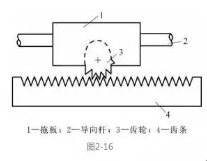 齒輪齒條裝置中 (圖2-16),如果齒條固定不動,當(dāng)齒輪轉(zhuǎn)動時,齒輪軸連同拖板沿 齒條方向做直線運動。這樣,齒輪的旋轉(zhuǎn)運動就轉(zhuǎn)換成拖板的直線運動。拖板是由導(dǎo)桿或 導(dǎo)軌支承的,該裝置的回差較大。
