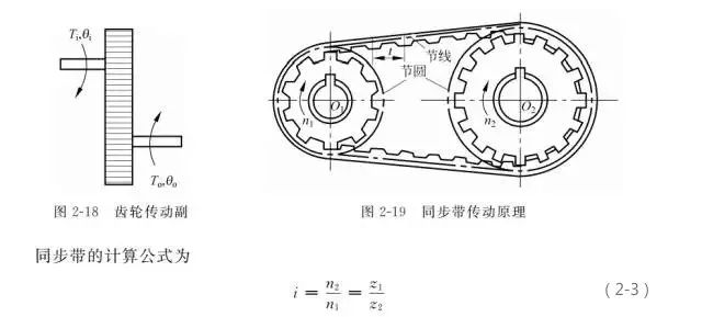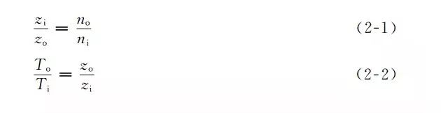 齒輪副不但可以傳遞運動角位移和角速度,而且可以傳遞力和力矩,如圖2-18所示, 一個齒輪裝在輸入軸上,另一個齒輪裝在輸出軸上,可以得到齒輪的齒數(shù)與其轉(zhuǎn)速成反比 [式 (2-1)],輸出力矩與輸入力矩之比等于輸出齒數(shù)與輸入齒數(shù)之比 [式 (2-2)]。