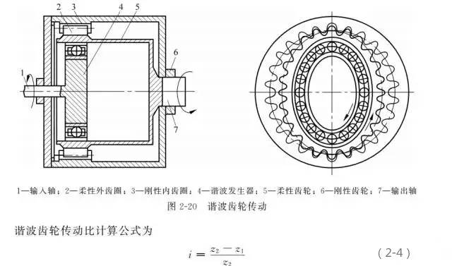 式中:z1 為柔性齒輪的齒數(shù);z2 為剛性齒輪的齒數(shù)。假設(shè)剛性齒輪有100個齒,柔性齒 輪比它少兩個齒,則當(dāng)諧波發(fā)生器轉(zhuǎn)50圈時,柔性齒輪轉(zhuǎn)1圈,這樣只占用很小的空間 就可以得到1∶50的減速比。通常將諧波發(fā)生器裝在輸入軸,把柔性齒輪裝在輸出軸,以 獲得較大的齒輪減速比。
