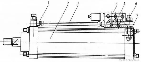 1-管接頭,2-氣缸,3-氣管,4-電磁換向閥,5-換向閥底板,6-單向節(jié)流閥組合件,7-密封圈。