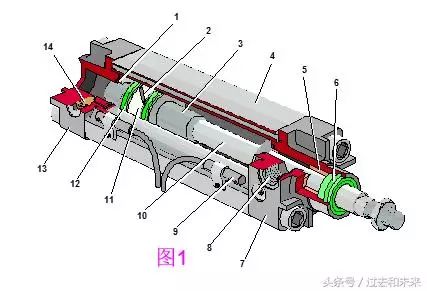 1、3-緩沖柱塞,2-活塞 ,4-缸筒 ,5-導(dǎo)向套,6-防塵圈,7-前端蓋,8-氣口,9-傳感器 ,10-活塞桿,11-耐磨環(huán) ,12-密封圈,13-后端蓋 ,14-緩沖節(jié)流閥