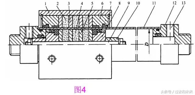 1-套筒,2-外磁環(huán),3-外磁導(dǎo)板,4-內(nèi)磁環(huán),5-內(nèi)磁導(dǎo)板,6-壓蓋,7-卡環(huán),8-活塞,9-活塞軸,10-緩沖柱塞,11-氣缸筒,12-端蓋,13-進、排氣口