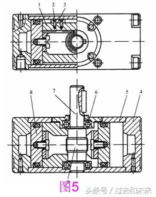 葉片式擺動氣缸體積小,重量最輕,但制造精度要求高,密封困難,泄漏是較大,而且動密封接觸面積大,密封件的摩擦阻力損失較大,輸出效率較低,小于80%。因此,在應(yīng)用上受到限制,一般只用在安裝位置受到限制的場合,如夾具的回轉(zhuǎn),閥門開閉及工作臺轉(zhuǎn)位等。