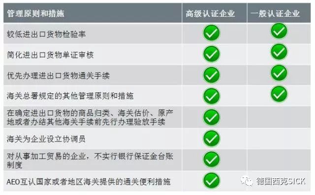 獲得AEO認(rèn)證的企業(yè),就可以取得相應(yīng)資質(zhì)的優(yōu)惠措施,提升自己的經(jīng)營和供應(yīng)鏈環(huán)境。對(duì)SICK而言,通過高級(jí)認(rèn)證意味著我們將獲得最低的進(jìn)出口貨物查驗(yàn)率、執(zhí)行最簡化的進(jìn)出口貨物單證審核、優(yōu)先辦理進(jìn)出口貨物通關(guān)手續(xù)、進(jìn)出口貨物出現(xiàn)價(jià)格、歸類問題時(shí),執(zhí)行優(yōu)先放行、事后核議、海關(guān)為我們?cè)O(shè)立協(xié)調(diào)專員、AEO互認(rèn)國家提供通關(guān)便利、社會(huì)誠信美譽(yù)度提高等優(yōu)惠便利。