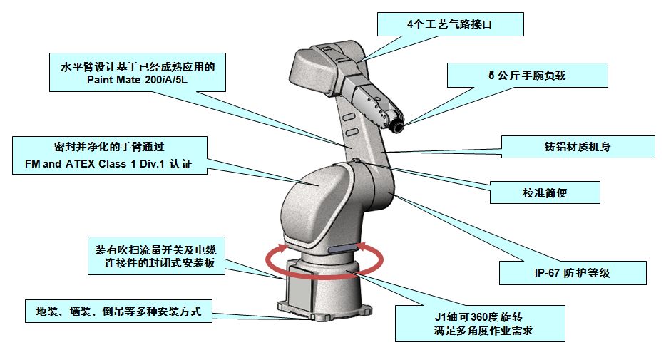 作為一款緊湊型機(jī)器人,P-40iA的可達(dá)半徑達(dá)到了1300mm,負(fù)載達(dá)到5kg,并采用防爆標(biāo)準(zhǔn)設(shè)計(jì),可滿足各種危險(xiǎn)環(huán)境下噴涂等應(yīng)用。同時(shí),P-40iA可適配FANUC PaintTOOL軟件,并提供噴涂行業(yè)中強(qiáng)大和便捷的應(yīng)用操作程序界面。