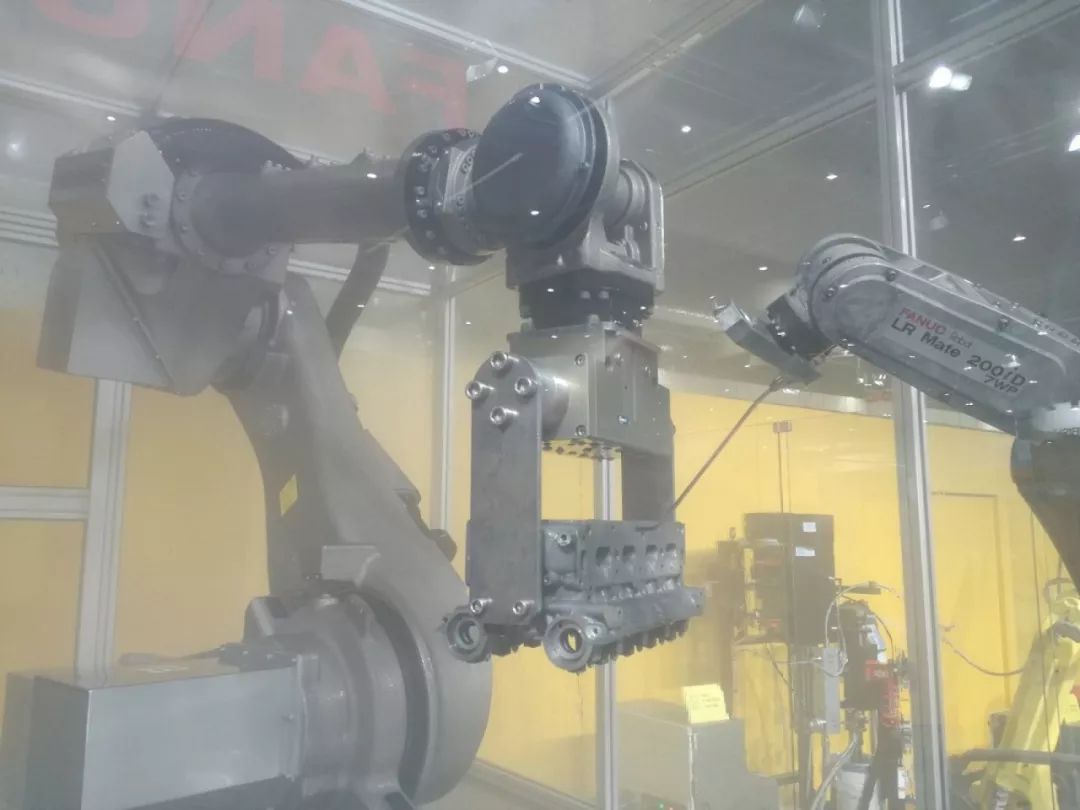 其中R-2000iC/210WE機器人抓取發(fā)動機缸體對準固定噴嘴,并變換多種姿態(tài),完成缸體表面的清洗;LR Mate 200iC/5WP機器人手持噴槍完成缸體內(nèi)表面的清洗。兩臺FANUC清洗機器人協(xié)同完成缸體的內(nèi)、外表面清洗工作,充分展示了FANUC清洗系列機器人優(yōu)良的防水性能。