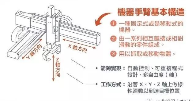 工業(yè)機(jī)器臂是“一種固定或移動式的機(jī)器,其構(gòu)造通常由一系列相互鏈接或相對滑動的零件組成,用以抓取或移動物體,能夠?qū)崿F(xiàn)自動控制、可重復(fù)程序設(shè)計、多自由度(軸)。其工作方式主要通過沿著X、Y、Z軸上做線性運(yùn)動以到達(dá)目標(biāo)位置?!?