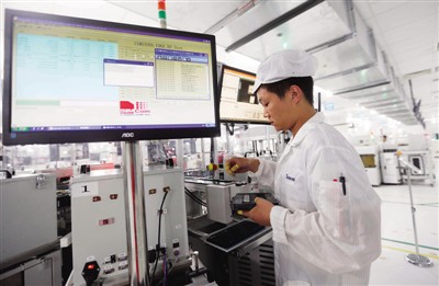 為了保持車間內(nèi)的恒溫恒濕環(huán)境,進(jìn)入車間前必須穿上鞋套、換上防護(hù)服、戴上工作帽。車間的左側(cè)整齊規(guī)劃了四條“手機(jī)通訊主板自動(dòng)測(cè)試線”,這也是晨訊科技已經(jīng)實(shí)現(xiàn)的無(wú)人化流水線,手機(jī)主板可在流水線上完成從下載到校準(zhǔn)的工序,全程只需要1到2名維護(hù)人員。在自動(dòng)化流水線上,機(jī)械臂有節(jié)奏地將不同模塊載入不同的檢測(cè)系統(tǒng),大大節(jié)約成本的同時(shí),更保證了產(chǎn)品的質(zhì)量和精度,機(jī)器的差錯(cuò)率幾乎為零。據(jù)介紹,從五年前起,晨訊科技就開始以自己的手機(jī)和通訊模塊制造廠作為試驗(yàn)基地,將標(biāo)準(zhǔn)機(jī)器人、視覺(jué)系統(tǒng)等,集成為一套套自動(dòng)化成套設(shè)備,成功地代替了一排排的非技術(shù)工人。接著是智能物流的AGV(無(wú)人搬運(yùn)車)和各種專用自動(dòng)化設(shè)備。在逐步實(shí)現(xiàn)工廠無(wú)人化的基礎(chǔ)上,再將所有設(shè)備連上互聯(lián)網(wǎng);通過(guò)PCS(過(guò)程控制系統(tǒng))、MES(制造執(zhí)行系統(tǒng))和ERP(企業(yè)資源管理系統(tǒng)),實(shí)現(xiàn)生產(chǎn)全過(guò)程的信息化、網(wǎng)絡(luò)化、智能化。目前在手機(jī)制造領(lǐng)域,規(guī)模排名前20的制造工廠大多數(shù)已經(jīng)購(gòu)買了其制造的各種智能裝備,部分工廠正在洽談?wù)麖S智能改造方案。